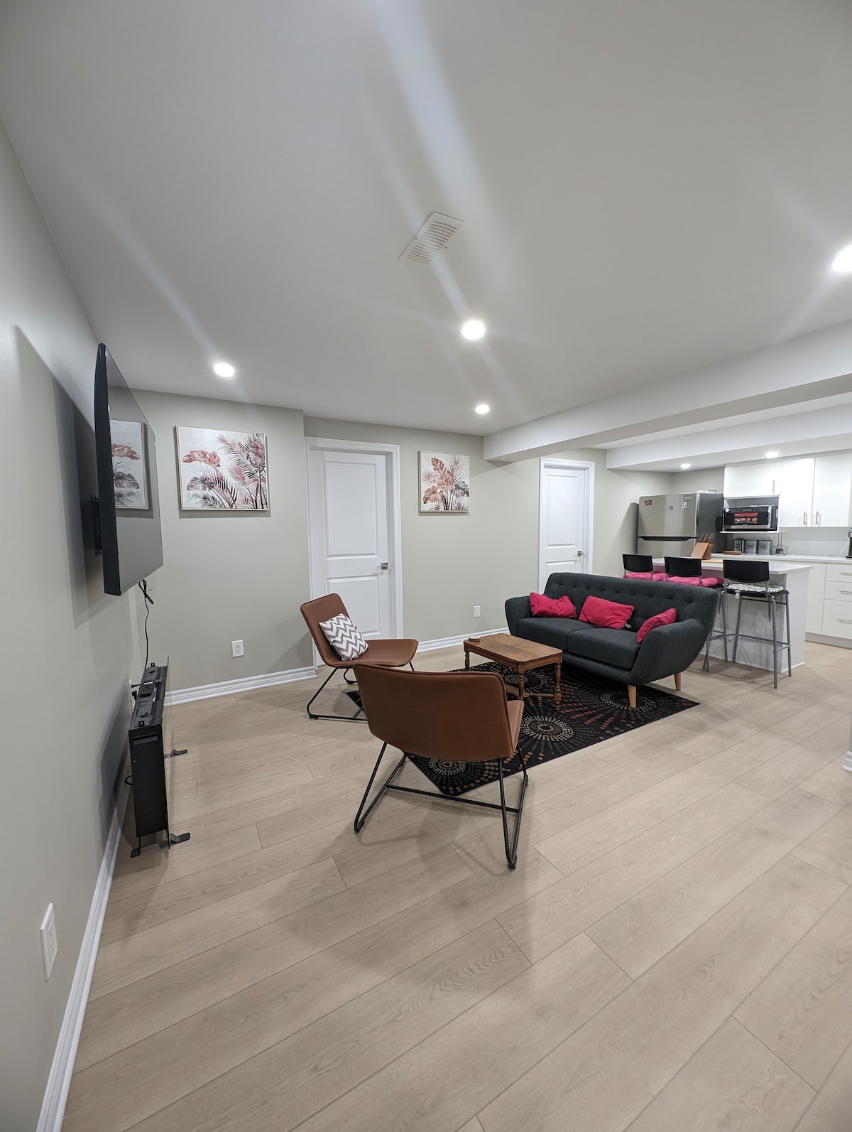Experience comfort and style in our newly finished, modern open concept kitchen and living room. Equipped with a TV, fridge/freezer, microwave/oven, air fryer, washer, and dryer. Just 8 mins from the airport, 20 mins to downtown, and walking distance to groceries, coffee shops, parks, and restaurants. Enjoy privacy with a separate entrance and secure bedroom with its own locked keys. Quiet neighborhood, perfect for business or pleasure. Book now for a memorable stay in Ottawa!