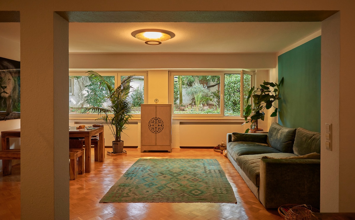 Style - Kunst - Leben - Natur Das sind die Komponenten, die ich zum Wohlfühlen brauche. So ist mein Design-60qm-Penthouse-Appartement sowohl mit Kunstwerken als auch mit Pflanzen und einem großen Aquarium ausgestattet und steht Euch komplett zur Verfügung. Es ist sauber, hell, ruhig, verkehrstechnisch gut gelegen und einfach zum Wohlfühlen. Der üppig bepflanzte Ost Balkon mit freiem Blick ist ideal fürs Frühstück oder laue Abende. Gut ausgestattete Küche, Markise und Klimaanlage sind vorhanden.