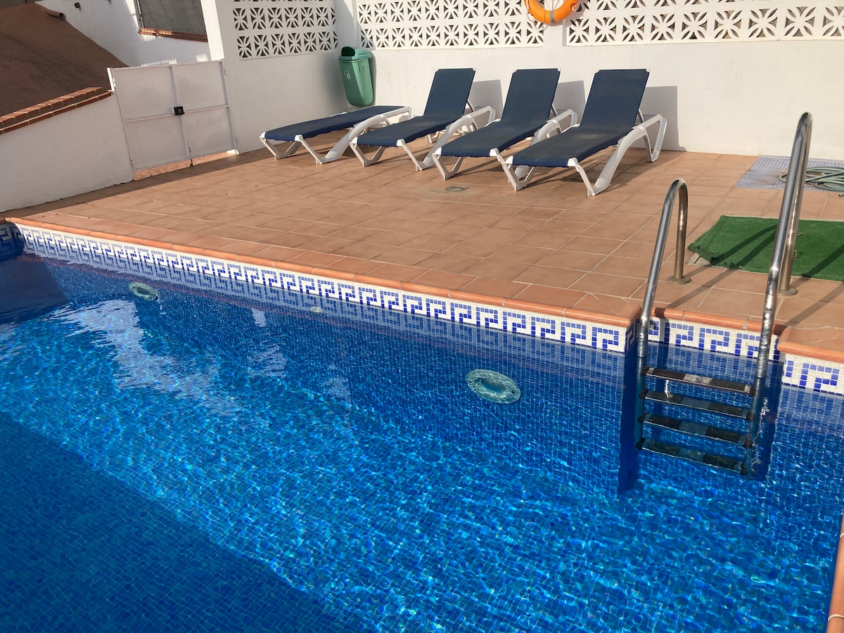 Impresionante casa adosada en Nerja muy cerca de la playa de burriana , cerca del Mercadona , también está cerca el club de tenis “la raqueta” y el estadio deportivo “Enrique Lopez Cuenca “ La casa consta de piscina y jardín comunitario y un jardín privado con una estupenda barbacoa y zona para tomar el sol . La casa tiene una amplia luminosidad y cuenta con aparcamiento en la puerta prácticamente. Wifi y aire acondicionado, placas solares y todo recién amueblado , muy recomendable. Smart tv 50’
