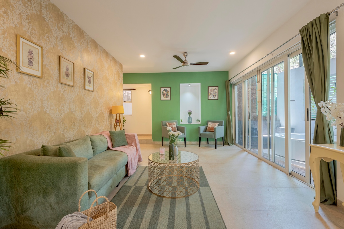 Our stunning bohemian-style 3BHK villa is nestled in a serene villa complex in Sinquerim, just a 5-minute stroll to the beach. The villa is beautifully furnished with chic bohemian interiors, ideal for families and groups of friends seeking a relaxing getaway. The complex has two swimming pools and beautiful lush gardens. Whether you choose to lounge by the pool, take a leisurely walk in the gardens, or enjoy the golden sands of the nearby beach, our villa is your perfect home away from home.
