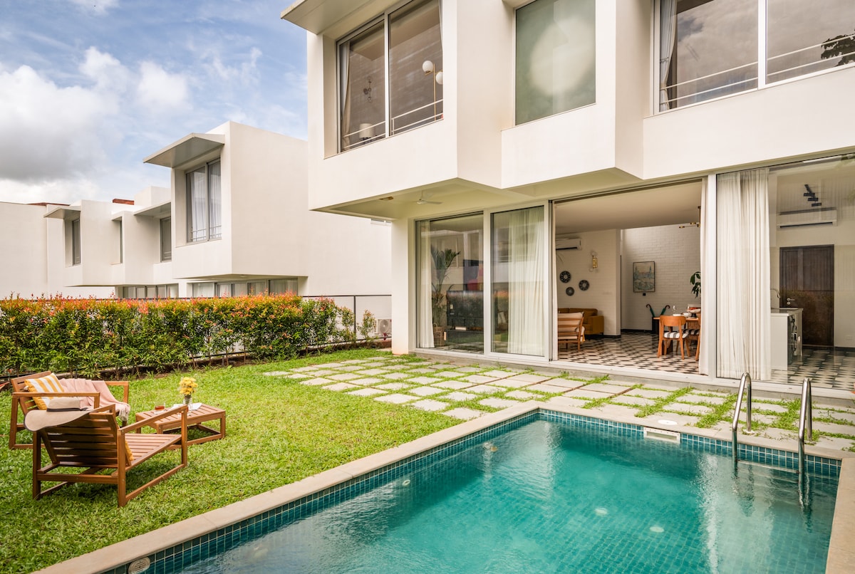 La Agueda Plunge Villa 15 — Your Private Tropical Escape Welcome to a modern luxury villa in Reis Magos, Goa, minutes from Coco Beach, Candolim, and the scenic Nerul River. Enjoy your private plunge pool, sunlit garden, patio, and chic interiors perfect for families or friends. Surrounded by lush greenery and close to Goa’s best eateries, bars, and beaches, the Villa offers the ultimate coastal escape — tranquil, stylish, and just moments from the buzz of North Goa and even Panjim City.