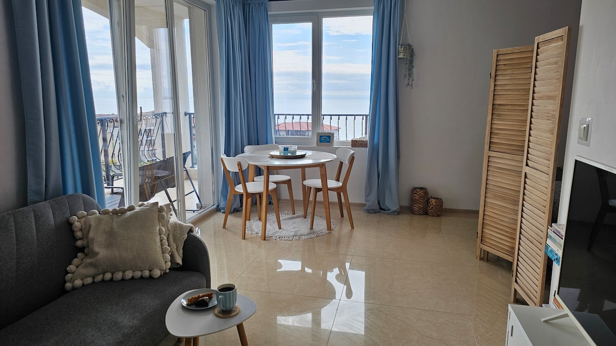 Vacation 10 meters from sea, beautiful fo sea and old town (Nesebar) view. Newly renovated, beautiful, prestigious apartment. Equipped with all amenities (swimming pool, SMART TV, Wi-Fi, washing machine, cooker, fridge, kitchen equipment). If you want to spend a unique vacation, this offer is for you. It can be remembered. The sound of the waves will wake you up every morning.