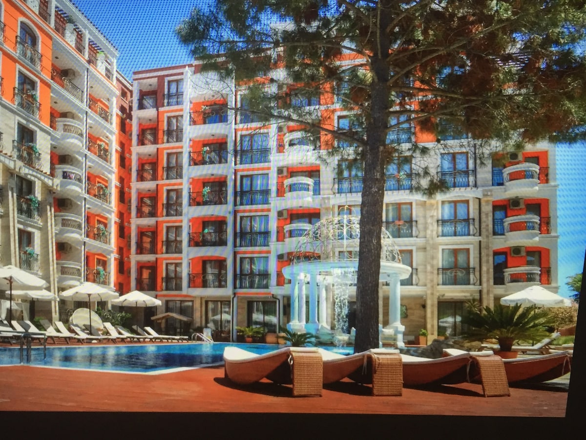 Свети Влас. Новый комплекс Sorrento Sole Mare с красивой территорией и бассейном. Квартира укомплектована всей мебелью и бытовой техникой для комфортного проживания. 2х кровать 160*200 Шкаф, обеденный стол, фен, гладильная доска и утюг, посуда и т.д. Большой балкон . К морю 5-7 мин пешком. К магазину 3 мин В пешей доступности рестораны, кафе, спортзал, аптека. От месяца - оплачиваются счета за электричество и воду. Уборка во время проживания и смена постельного белья за доп. плату.