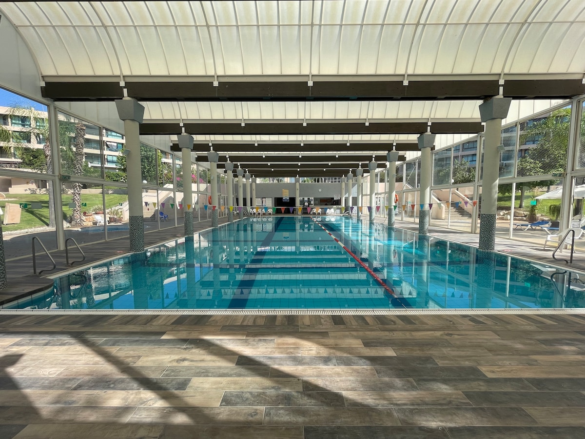 Private luxury apt with sea view at a beautifulll resort. Master bedroom & living room have large windows over ocean view, kids bedroom with two twin beds. The complex includes free swimming pools, jym, squash, tennis cour, lush well-kept gardening and playgrounds. 5 min drive from the old city & There are 2 big shelters in each level of the building. The apt is 15 meter from each of them.
