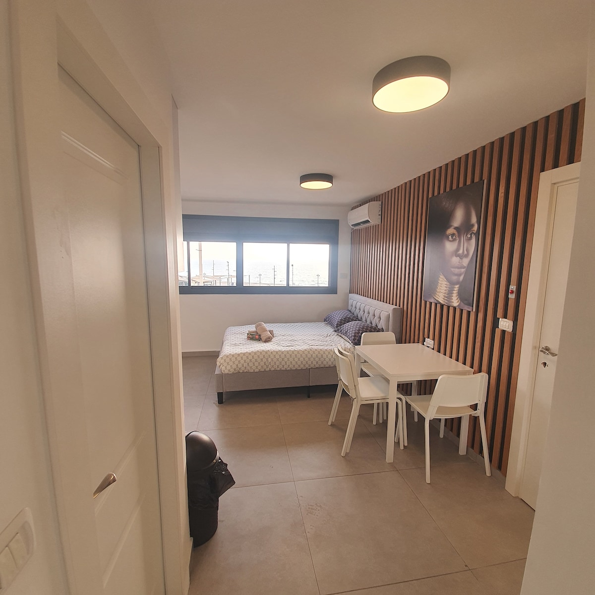 Upon returning home from Banana beach or Carmel market, each 2 min by foot, w/your grocery bags/bathing suits, you enter your seaview apartment, hang your wet things on the balcony, or in the shower in the stone bathroom. Take a hot shower then sip some wine, kick your feet up on the deck or in the bedroom or watching your favorite movies on the HD widescreen or in the bedroom TV. The late night sounds you hear from the 6th floor are the waves.
