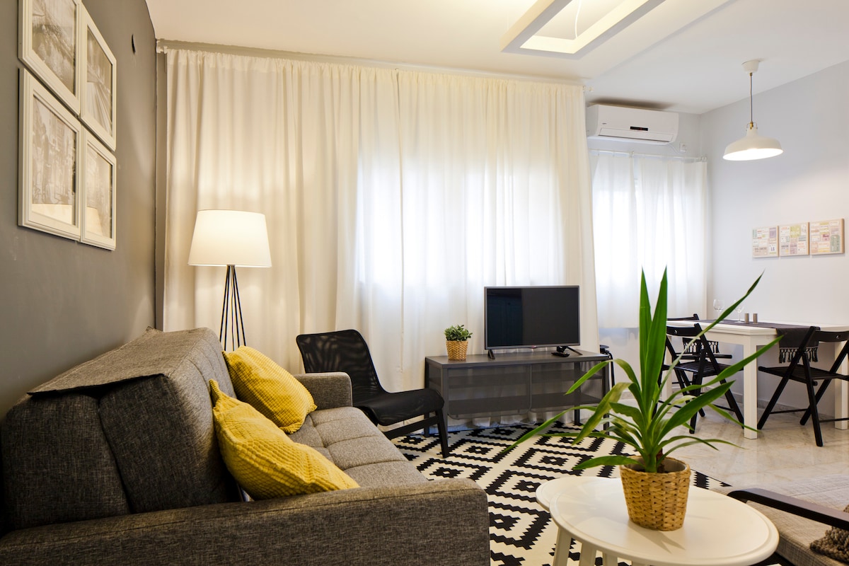 Enjoy our comfortable 2BR apartment with a true urban and local feeling. The apt. can comfortably fit up to 6 people, completely renovated and located minutes' walk from the beach, Rothschild Blvd, Dizengoff Center, Habima Theater, restaurants &cafes