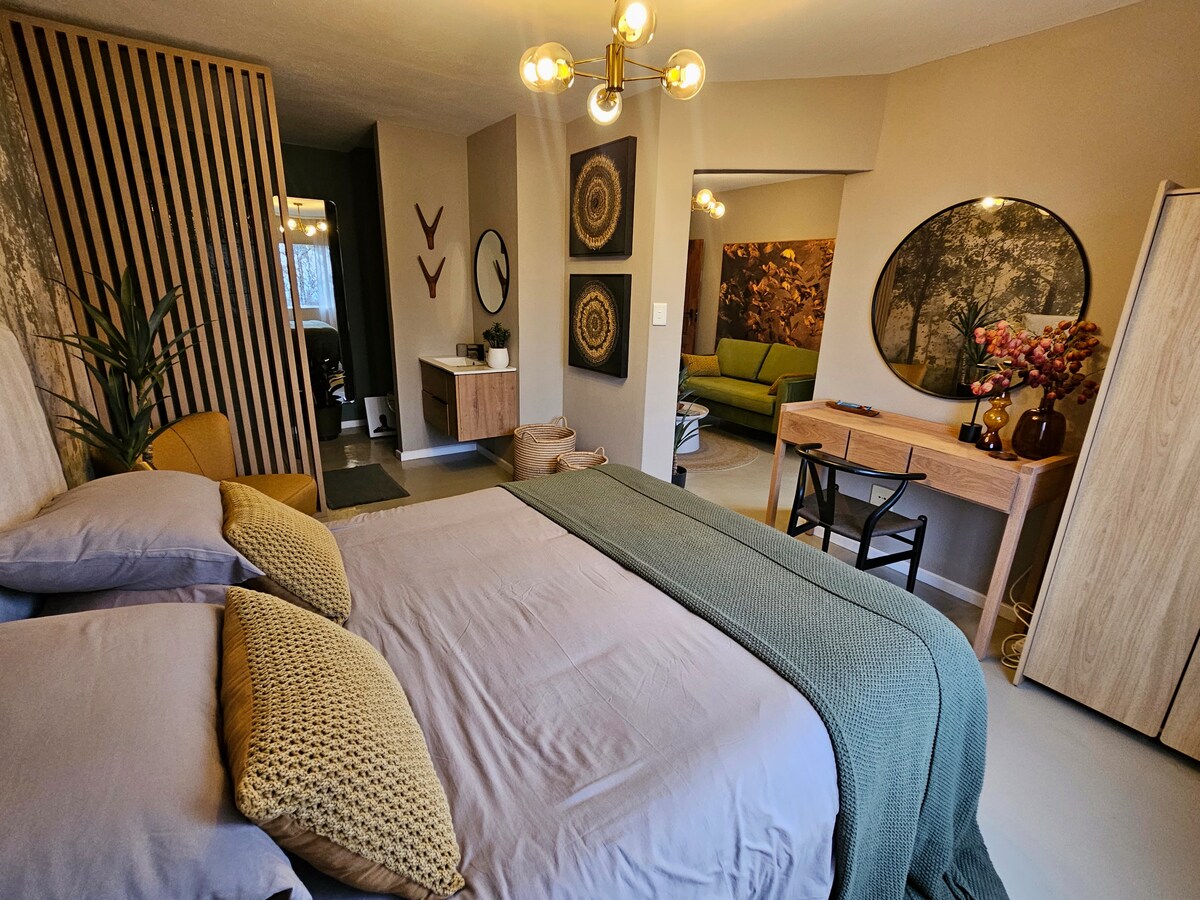Baobab Self-Catering Suite can accommodate 2 people. Discover tranquility in our Baobab Suite, perfect for any traveller. Enjoy a private entrance, open-plan living area, full kitchen, workstation, and free WiFi. Unwind in the modern bedroom with a queen size bed and en-suite bathroom. The suite boasts views of lush gardens and a beautiful pool. Includes free parking and a Smart TV. Close to attractions, dining, nature reserves, and shopping. Ideal for relaxation or a productive stay.