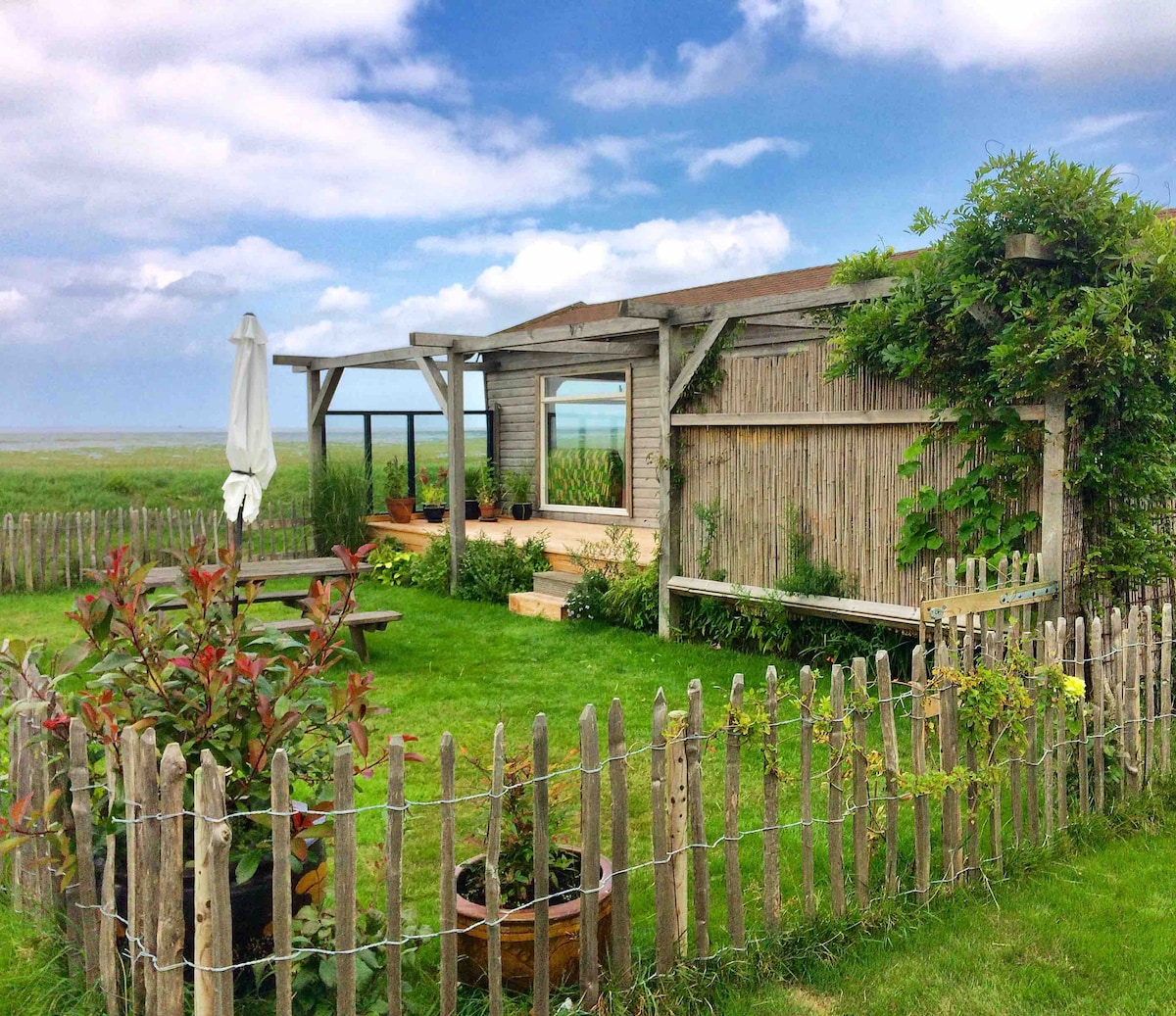Topview over Waddenzee vanuit retro-ingerichte hut