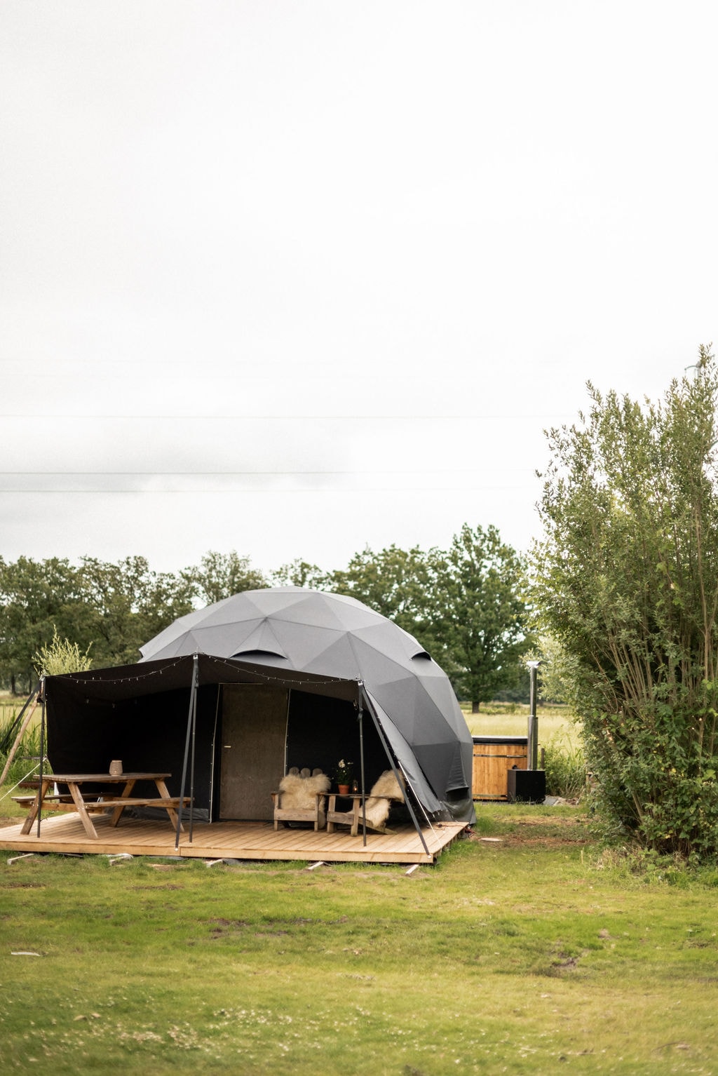 De ronde vorm en de vele ramen bieden werkelijk een prachtige kijk op het landschap. De unieke houten structuur geeft het een natuurlijke en sfeervolle uitstraling. De Dome met eigen buitenterras voelt direct aangenaam en warm aan. Tevens heb je buiten de gelegenheid om heerlijke maaltijden klaar te maken op de aanwezige kooktafel. Het verblijf is geschikt voor 2 personen en ingericht met een boxspring, koelkast, koffie-machine en waterkoker.