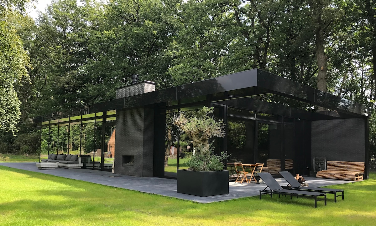 Luxe wellness aan de rand van het bos op de Veluwe. Uniek gastenverblijf voor twee personen met exclusief privégebruik van het overdekte zwembad, douches, eigen badkamer en (finse) sauna. Eigen inrit en volledig ingerichte keuken in parkachtige tuin. Geen dieren toegestaan! Het gebouw bestaat voor een groot deel uit (deels gespiegeld) glas en heeft geen gordijnen. Op fietsafstand van de Hoge Veluwe, station Apeldoorn en Paleis het Loo. Ideale locatie voor mountainbike, running en fietstochten.