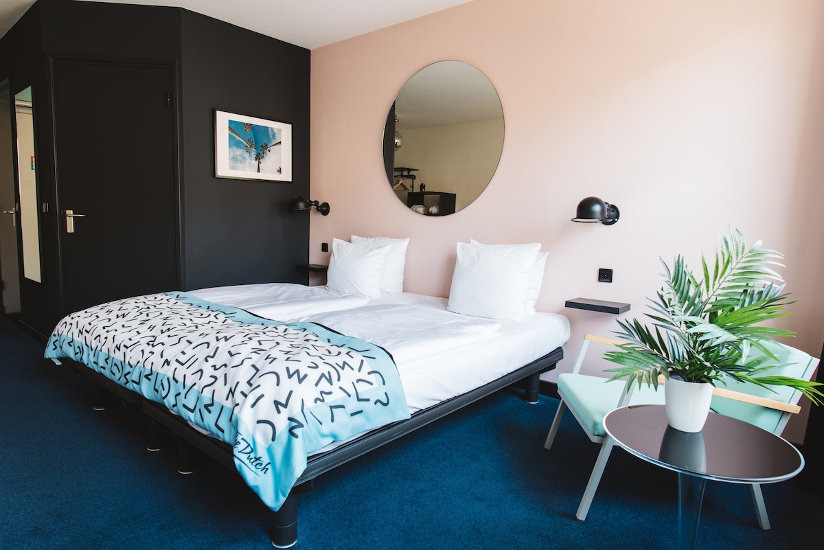 Backstage Hotel is the perfect start and end for your Amsterdam adventure! Close by, you'll find iconic music venues like the Melkweg, Paradiso, BourbonStreet, and Maloe Melo. You can pick up a guitar and play! (just bring a little talent). If you feel like listening, you can borrow a record player and some records from our collection. All of our rooms are designed in a music theme. Take a look at our gallery! This room is a perfect fit for 2! *The Backstage hotel does not have an elevator.