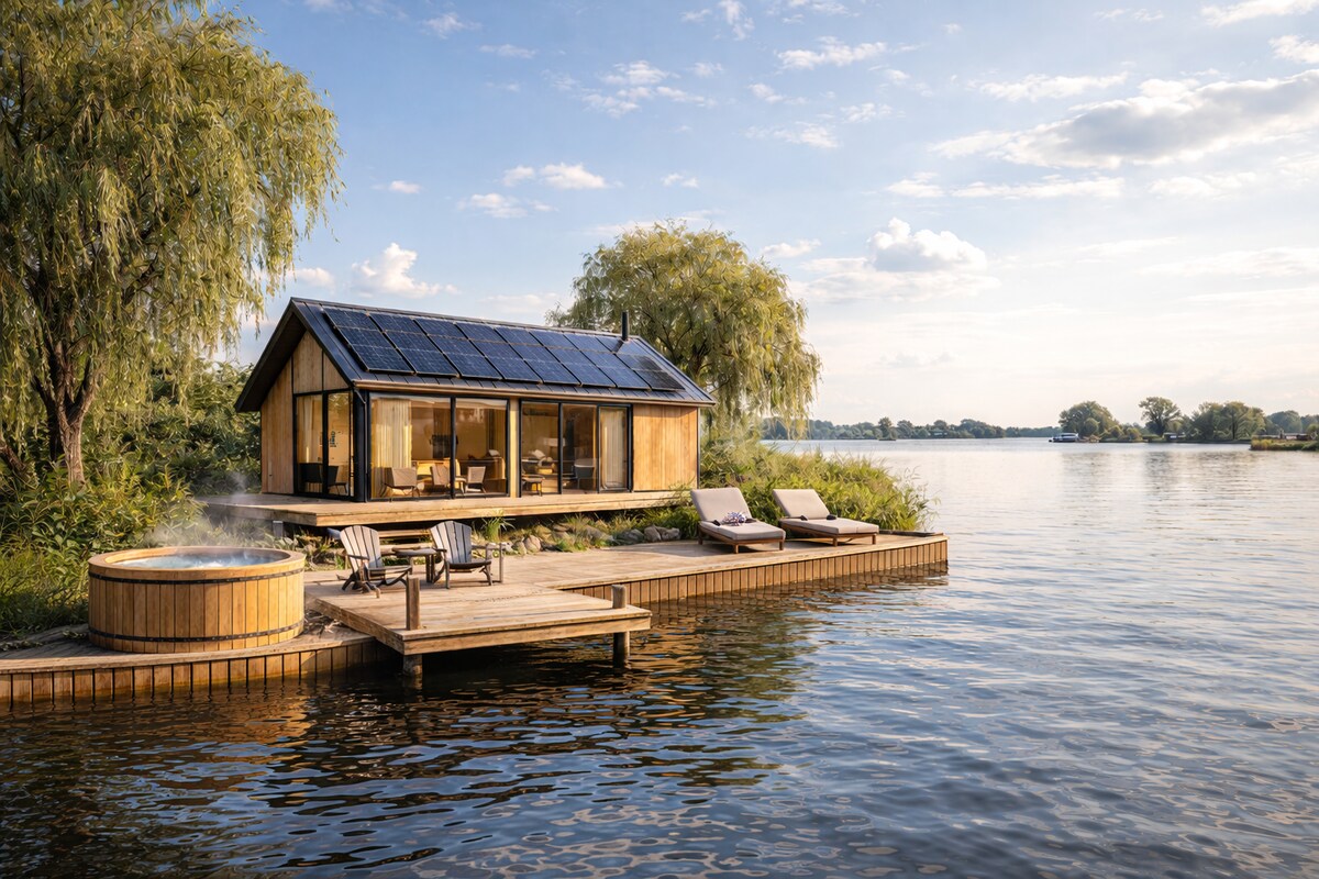 This unique house is a former greenhouse located on an island. In 2023, it was rebuilt and now features a fresh and charming interior. The house is accessible only by boat. Of course, we provide a boat equipped with an electric outboard motor. Upon your arrival, we’ll pick you up and show you how to operate the boat, as well as how to tie knots and secure the boat properly. Let the adventure begin!
