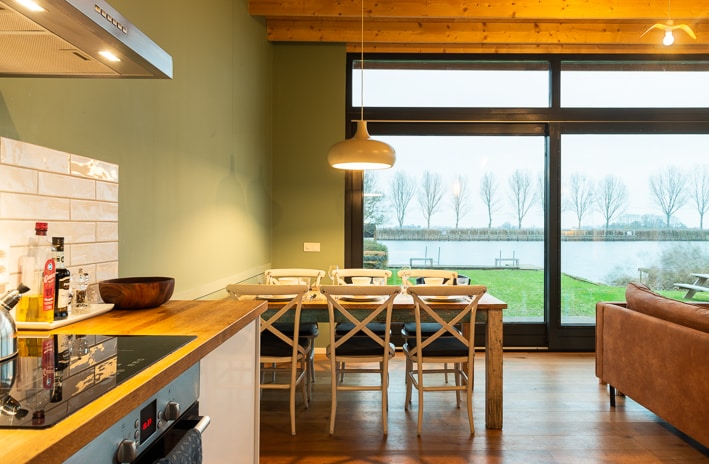 Luka's Hut, our beautiful eco-cabin, sits on the banks of the Ganzendiep river in Overijssel. Huge windows provide stunning Dutch views onto the river, the grass meadows with cows & sheep and a picturesque village in the distance. The river is quiet water so have a sauna & a swim, take out the kayak, big canoe or SUPboard. We have a heatpump for the floor heating, and used upcycled items such a charming wood-stove, a fantastic bath, a fully-equipped kitchen, bikes, a firepit & trampoline.