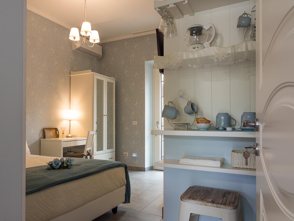 Elegante e confortevole la camera, con vista sul giardino, dispone di tutti i comfort: aria condizionata, wifi, TV. Possibilità di letto matrimoniale o due letti singoli. Amenities da bagno, macchina Nespresso per il caffé mattutino in camera con capsule in omaggio.