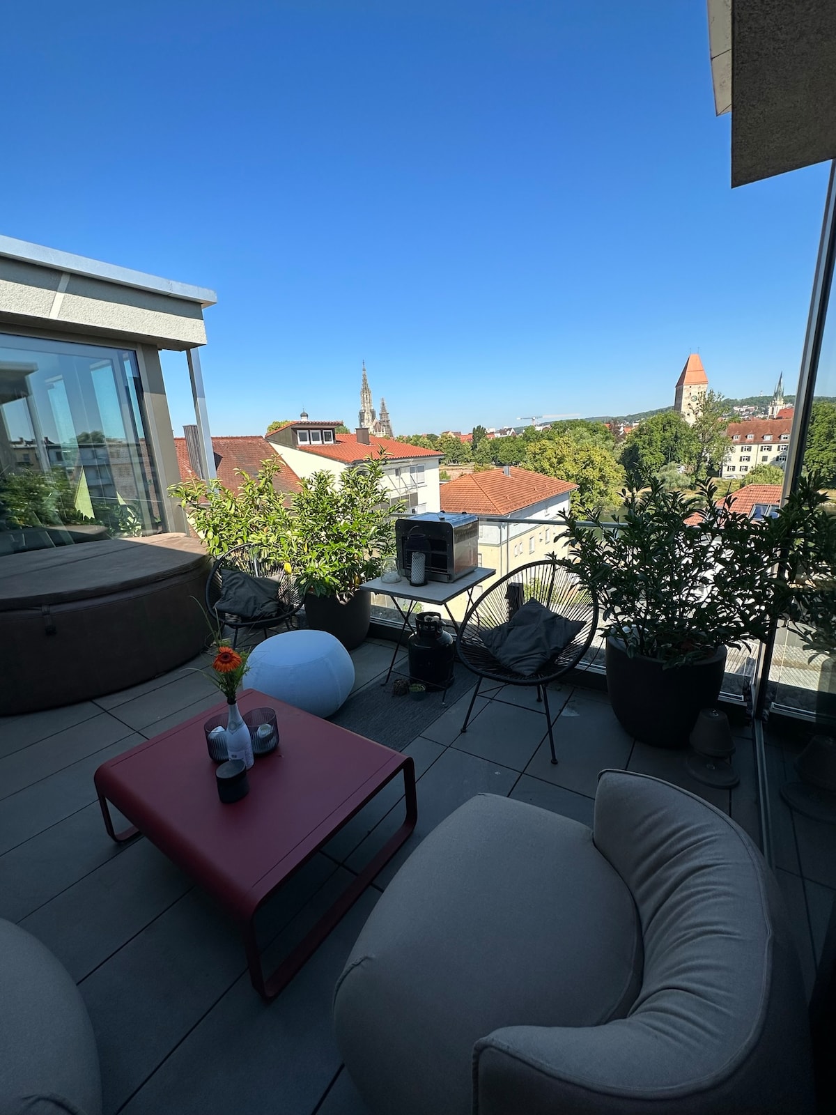 Genießen Sie die Zeit in dieser 171,5m² Luxus Penthouse Whg. im Stadtzentrum von Neu-Ulm mit Annehmlichkeiten wie: - Klafs Sauna - Terrasse m. Jacuzzi, Grill & Münsterblick - Fitnessraum m. Technogym Geräten - Treppenzugang zur Donau ideal zum Ein- & Aussteigen mit Booten & SUP´s - Sonos Soundsystem in allen Zimmern - 2 private Stellplätze m. eigener Wallbox für E-Autos - Lüftungsanlage - Fußbodenheizung Die gesamte Ausstattung ist sehr exklusiv & hochwertig. Die Kaution beträgt 4.000,- EUR
