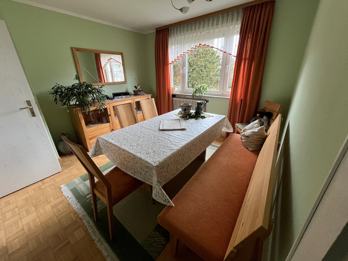 Wir bieten ein geräumiges, voll ausgestattetes Einfamilienhaus, das geschmackvoll und mit viel Liebe eingerichtet ist. Neben der schönen Umgebung, die zum Wandern, Radfahren und Entdecken einlädt, bietet das Haus viel Platz zum erholen, einfach sein und sich entspannen. Die sonnige Terrasse und ein großzügig angelegter Gartenbereich laden dazu ein. Das Haus hat einen separaten Eingang, der nur von den Gästen benutzt wird und Parkmöglichkeiten am Haus.