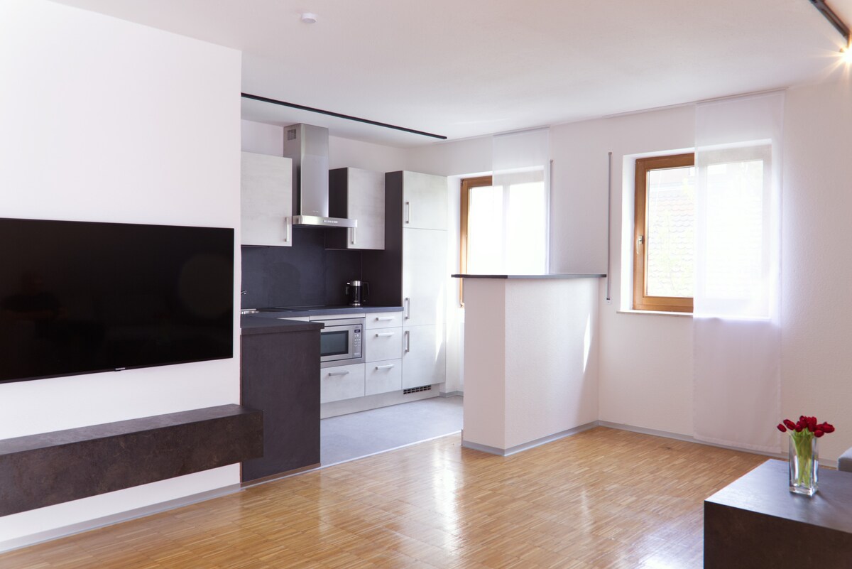 Welcome to MK Apartments and this Cozy single room in the heart of Aulendorf that has it all: → Smart home with tablet control for convenience → Underfloor heating for comfort → Fully equipped kitchen → Comfortable beds for a restful night's sleep → Smart TV with Apple TV, Netflix, Prime, Disney+ → Balcony with garden furniture → Free WLAN → Weekly cleaning and laundry service → 24-hour automatic check-in → Underground car park → Snack vending machine available