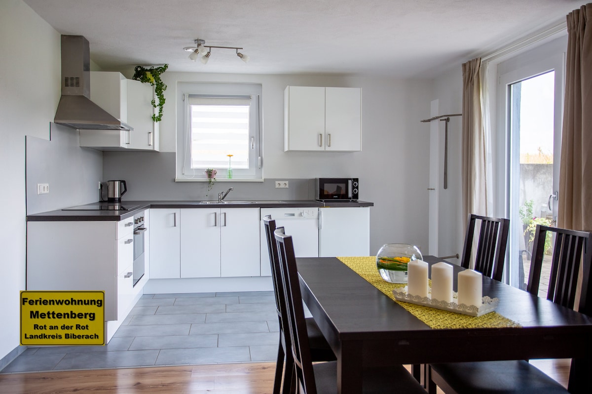 calm atmosphere at the edge of town ( fantastically quiet) where it is possible to wind-down and relax from everyday life. 1 Bedroom with double bed 140 x 200, (childs travelcot is available) 1 Kitchen complete with Oven, Fridge, dishwasher, cutlery & plates 1 Sofabed for 1 or 2 people 1 Bathroom /toilet own flat with a separa. Comes with it`s own parking space. Just 20 km from Memmingen Airport (Munich West) takes just 15 mins with the car.