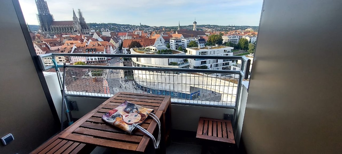 This apartment is in the heart of Ulm/Neu-Ulm with a balcony and breathtaking view of the beautiful old city of Ulm and the Danube river. Enjoy easy access to everything from this perfectly located 1 room apartment. Restaurants, bus stops, train stations, all at walking distance. Neu-Ulm train station is just 10 min by walk. This apartment has a kitchen with coffee machine, mini fridge, microwave, kettle, toaster and an attached bathroom.