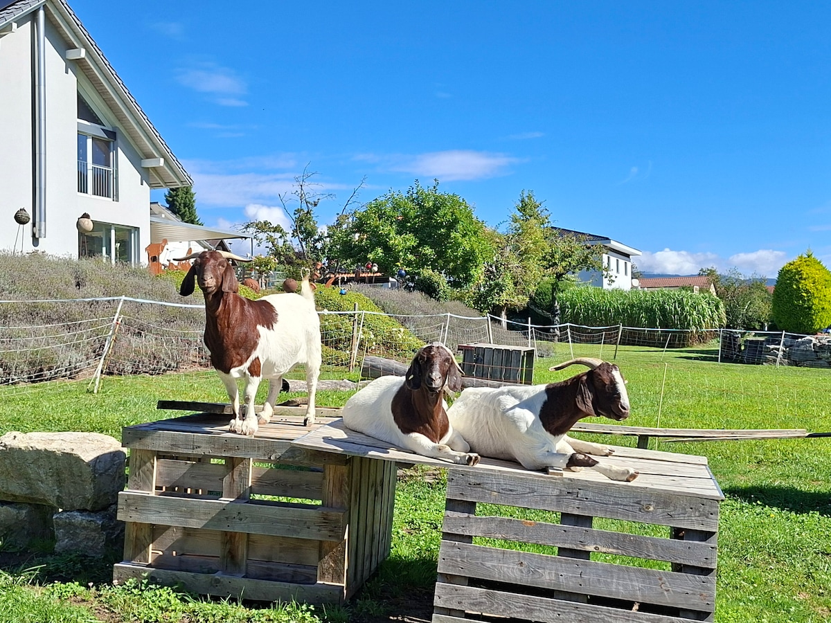 Fern ab vom Alltagsstress in einem idyllischen Wohnquartier, an der Küste des Neuenburgersees befindet sich unser Zuhause mit ganz besonderem Zauber. Am plätschernden Brunnen und verborgen im ehemaligen Bauernhaus aus dem Jahre 1878 befindet sich unsere liebevoll eingerichtete Ferienwohnung mit Blick direkt in die Scheune, den Brunnen und den Pferdestall. Es stehen drei individuell gestaltete Aufenthaltsbereiche zur Verfügung. Eine Sauna kann nach ebenfalls genutzt werden (10 pro Saunagang).