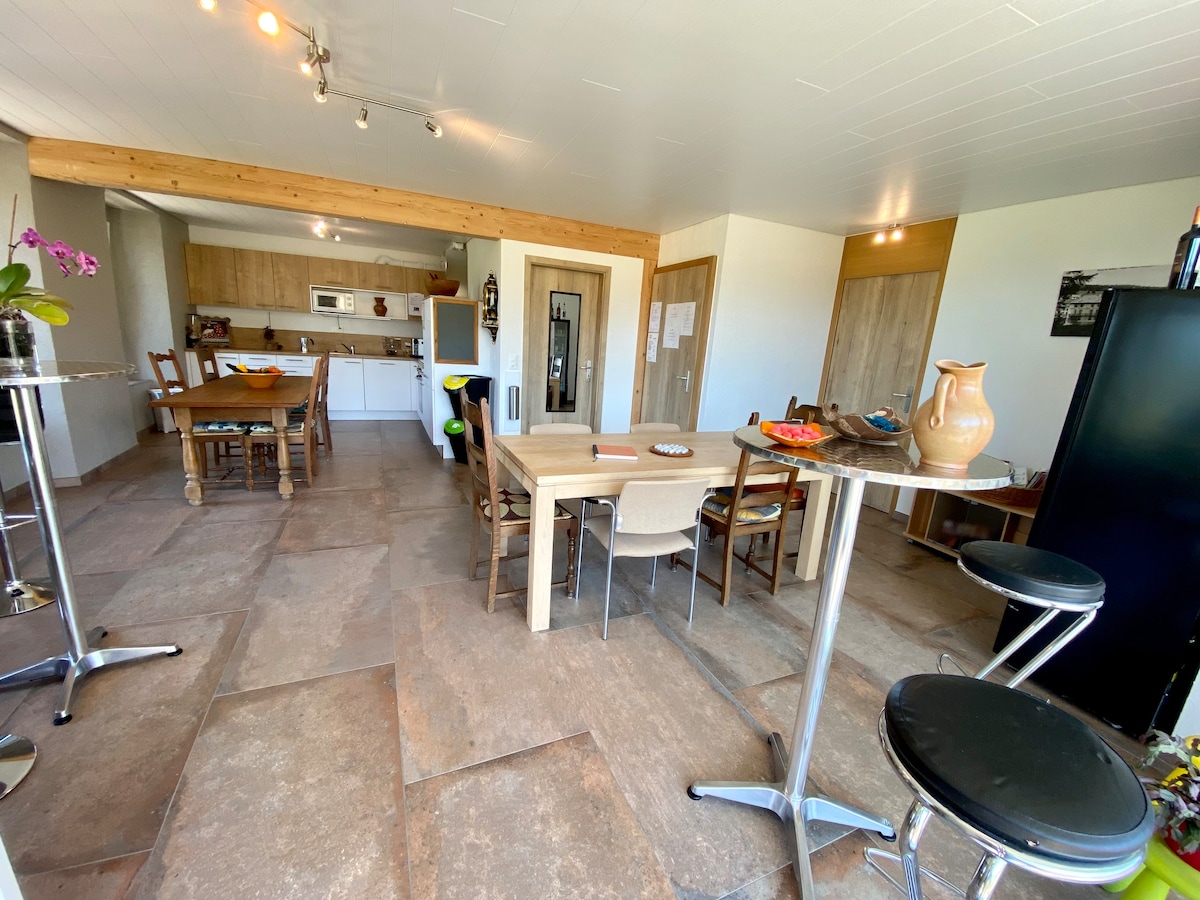 Appartement spacieux de 165 m2 (en triplex avec mezzanine), rénové dans une vieille ferme Neuchâteloise. Jardin avec terrasse et coin feu à disposition. Cuisine agencée (lave-vaisselle, plaque induction, four à vapeur et ancien four à pain utilisable pour les pizzas). 2 salles de bains (1 douche/baignoire/WC et 1 douche/WC). 3 chambres à coucher. Séjour ouvert sur la cuisine avec poêle à bois. Wifi + réception 4G/5G. Sauna extérieur à disposition (prix en supplément).