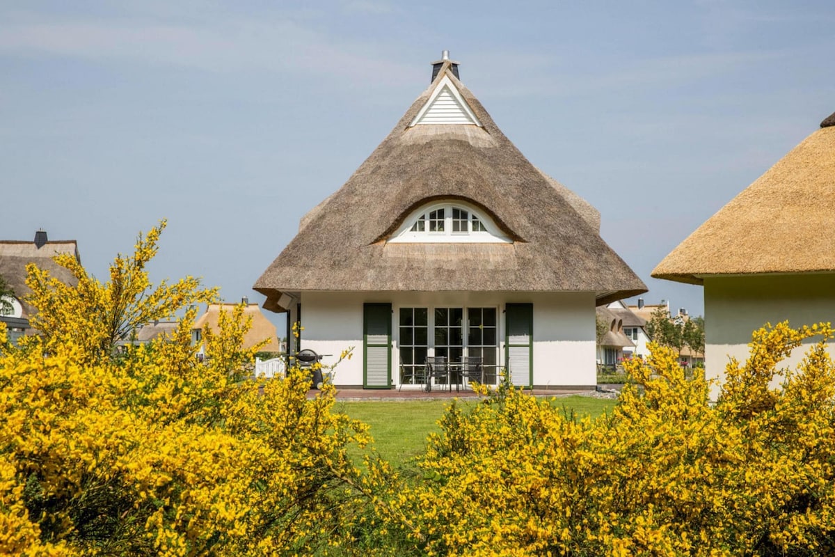 Enjoy the peace and quiet under the thatched roof in the wild and romantic north of Rügen. The spacious semi-detached house in the Lancken district has an open living-dining area on the ground floor, a cozy fireplace and a high-quality kitchen. The thatched cottage also has a sauna and there are three comfortable bedrooms on the upper floor. Relax in your own sauna and spend cozy evenings in front of the fireplace.The municipality of Dranske is located in the north of the island of Rügen, surrounded by the largely untouched lagoon landscape. The highlight is undoubtedly the kilometer-long sandy beach near Dranske, which is also ideal for the little ones for paddling, as the water is very shallow here. Tip: You will find the oldest restaurant in Rügen in the village. Guests have been served in the "Schifferkrug" since 1455. Highlights included: Usage-based energy costs Visitor's tax WLAN Activities nearby: Explore your surroundings and the island of Rügen with all its diversity. The gently sloping sandy beach is also just a few minutes' walk from your villa. Let your soul dangle and enjoy your time on the beach and in the sea - did you know that the local region is the sunniest area in Germany? Our service staff will be happy to provide you with insider information for excursion tips. For active vacationers, a hike/bike tour to Cape Arkona is a must. The attractive route leads 10 km along the coastal forest to the northernmost point of Rügen, always with a view of the sea. The nearby island of Hiddensee is also the perfect destination for all holidaymakers who love "sea and nature"; want to enjoy and experience. Layout: Ground floor: (bathroom(shower, toilet, hairdryer)) On the 1st floor: (bedroom(double bed(180 x 200 cm), TV(satellite)), bedroom(double bed(180 x 200 cm)), bedroom(2x single bed(90 x 200 cm)), bathroom(bath tub, shower, toilet)) open kitchen(dining table, hob(ceramic), electric kettle, toaster, coffee machine, oven, microwave, dishwasher, fridge-freezer), Living/diningroom(TV(satellite), radio, CD player, heating(floor heating)), storage, tumble dryer, sauna, private infrared cabin, washing machine, terrace, garden, garden furniture, parking, parking, parasol, high chair, baby crib(free)