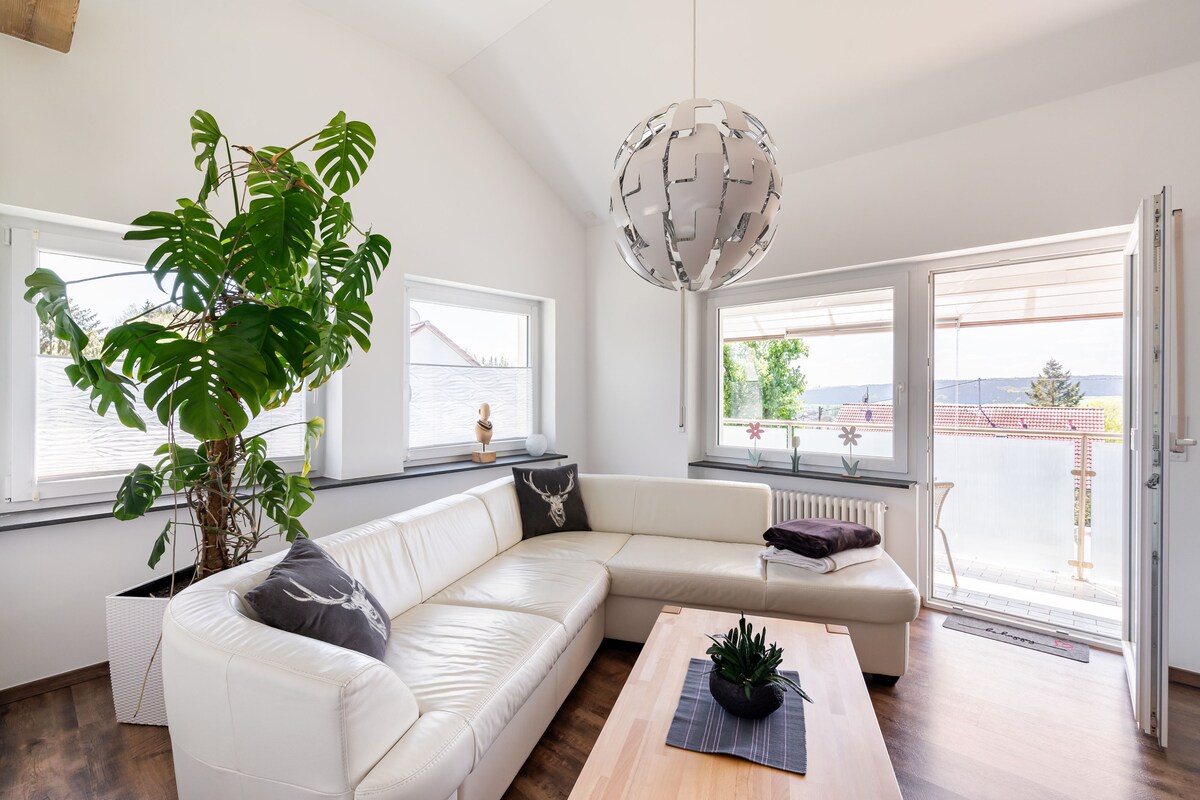 Sonniges, modern eingerichtetes 78m² Apartment mit Balkon in Süd-West Ausrichtung und herrlichem Weitblick für 2 (4) Personen. Entspannung in ruhiger Lage. Von dem idyllisch, auf einem Hochplateau der Baar, gelegenen Ort Brigachtal erreichen Sie in nur 5 Autominuten: Die Kreisstadt Villingen-Schwenningen mit seiner historischen Altstadt. Bad Dürrheim, der Kneipp – Kurort mit Sole – Heilbad Landschaften. Donaueschingen, die zweitgrößte Stadt des Schwarzwald – Baar – Kreis mit der „Donauquelle"