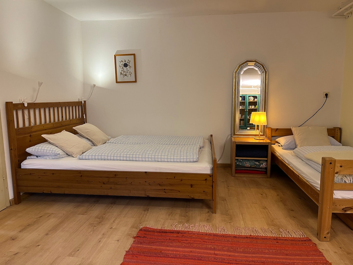 Helle 2-Zimmer-Wohnung mit einem separaten Eingang. Die Wohnung ist voll ausgestattet, genauso die Küche. Das Schlafzimmer hat ein Bett (140x200cm), die dritte Person kann auf dem Sofa schlafen. Im Schlafzimmer befindet sich eine Kleiderstange und eine Kommode. Im Wohn-Essbereich gibt es ein großes Sofa, ein Fernseher und ein Esstisch. Das Bad hat eine Dusche, ein Klo und ein Waschbecken. Eine Waschmaschine kann auf Wunsch genutzt werden. Parkplätze gibt es direkt vor der Wohnung.