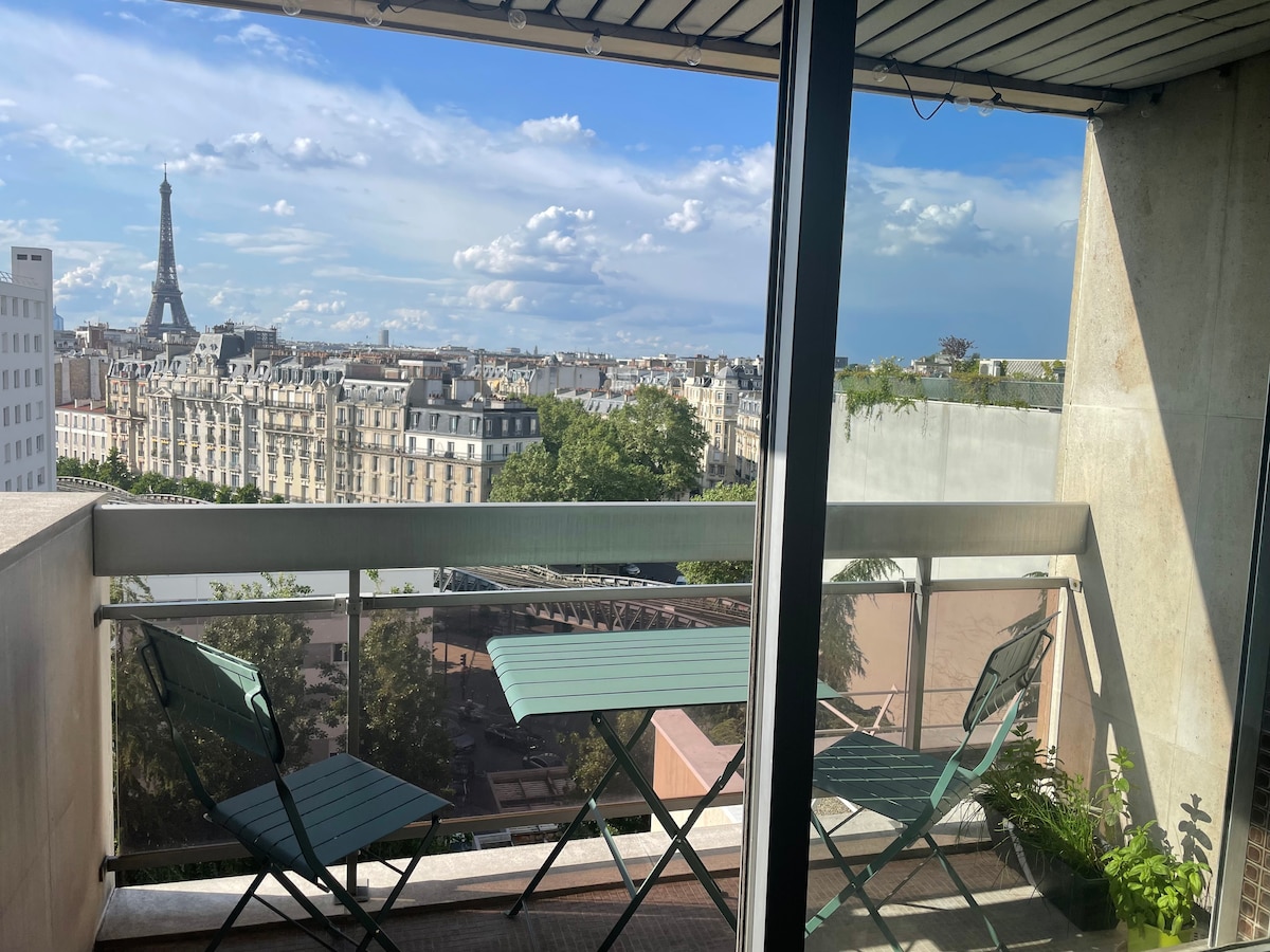 Studio architecte de 19 m² optimisé • Grande terrasse privée de 6 m² exposée, incroyable vue dégagée Tour Eiffel ! • Espace nuit avec lit confortable (160x200) • Coin cuisine tout équipé (machine à café, micro-ondes, frigo, vaisselle, etc.) • Salle d’eau moderne avec douche et WC 7e étage avec ascenseur jusqu’au 6e / Très lumineux ✨ Calme absolu – immeuble sécurisé et bien entretenu Transport : à 1 min à pied de la station « Pont de Neuilly » Metro L1 /!\ Interdiction formelle : fête/soirée /