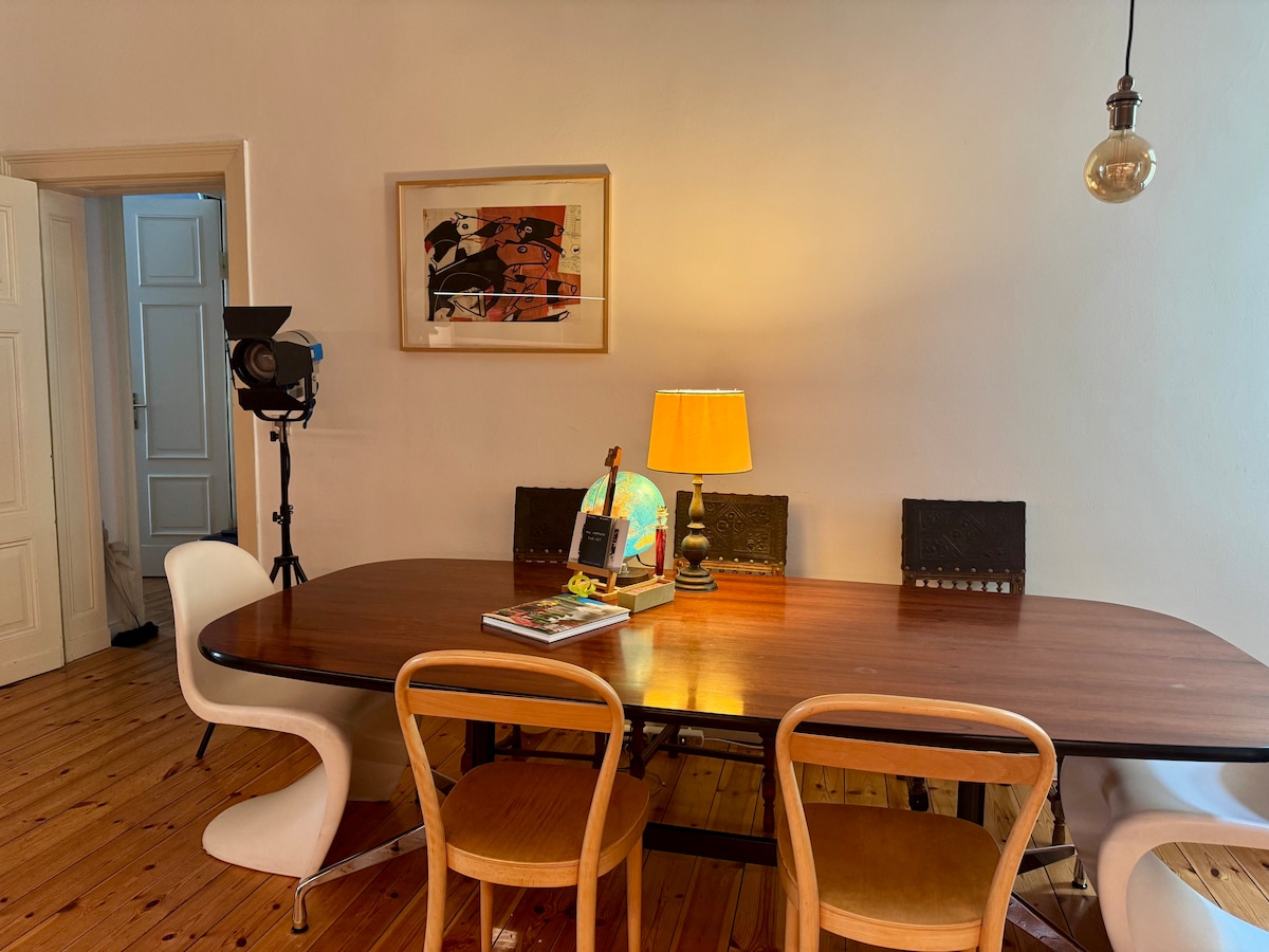 Hoch oben im gelben Eckhaus am Park: Viele Quadratmeter und die Möglichkeit, bis zu 12 Gäste unterzubringen, erlauben es, von hier aus mit der ganzen Familie und mit Freunden Berlin zu erobern und zu Feiern! Ein Mal-Atelier im Dachgestühl, selbst errichtet. Wir sind Künstlerin und Designer und haben einen Malsaal, ein Schlafzimmer, eine grosse Wohnküche, ein Wellness-Bad und ein Gäste- und Spielzimmer passgenau eingebaut. Das ist Eure Unterkunft!