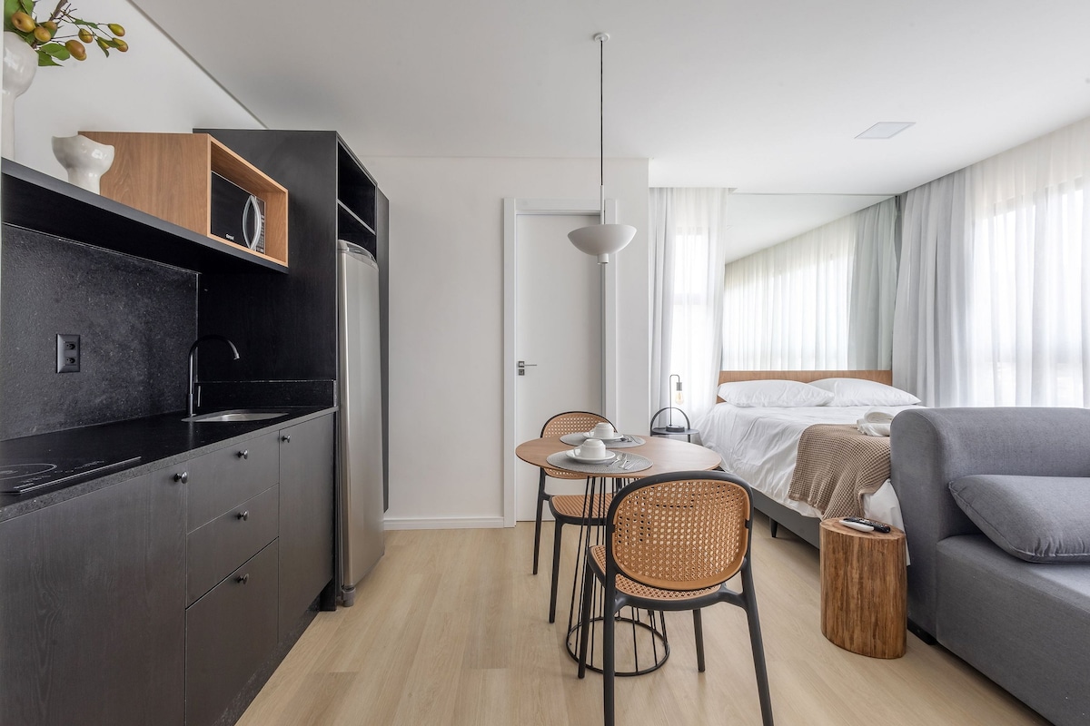Sofisticado apartamento studio localizado a 800m do parque Vila Germânica - local de eventos como a Oktoberfest. Rodeado por restaurantes, bares e supermercados. Tudo para o seu conforto: Smart TV 50" Samsung, ar condicionado split, chuveiro a gás, wifi fibra 240mb, cozinha completa com geladeira Brastemp, microondas, forno, fogão, coifa, cafeteira, purificador de água, lava e seca, guarda-roupas, e é claro uma cama queen convidativa com o melhor colchão!