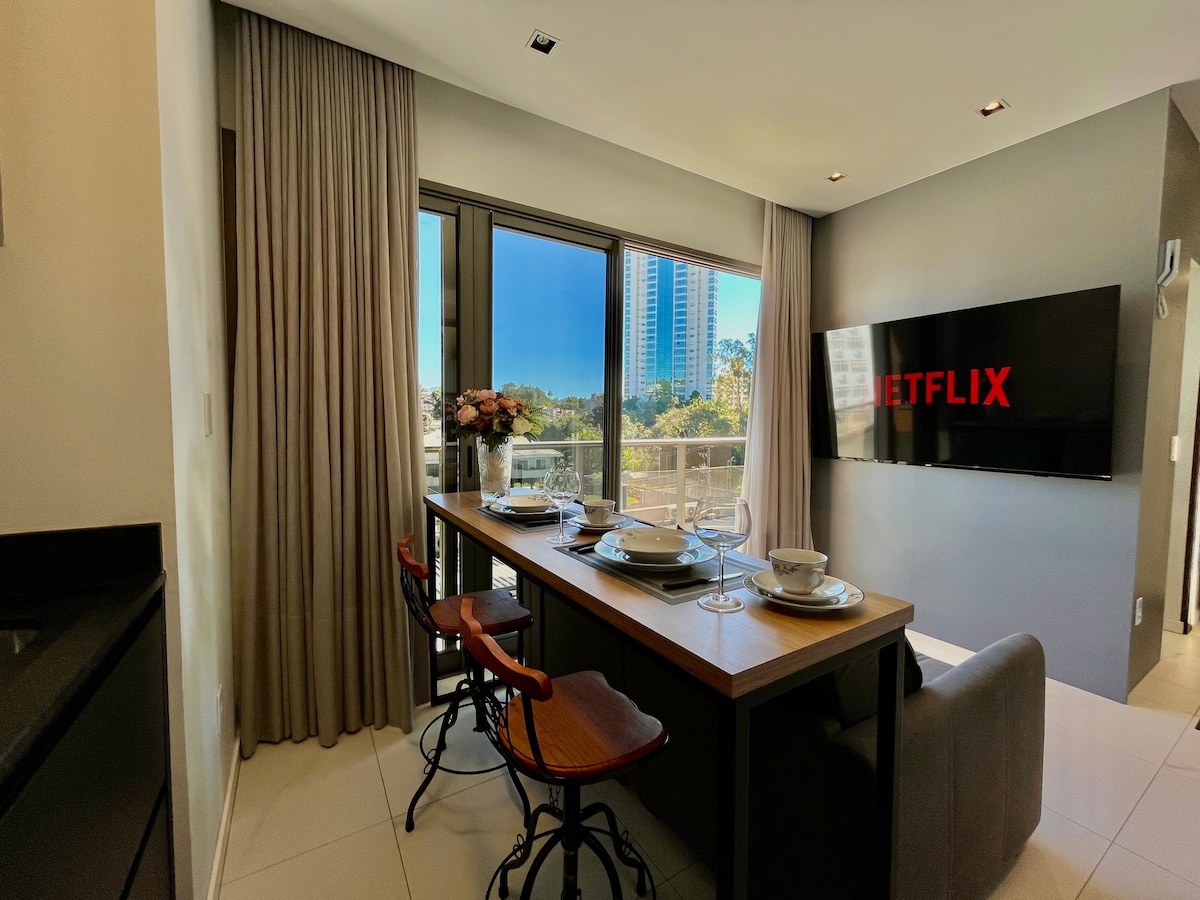 "Loft moderno e aconchegante, com vista panorâmica, ao lado da FURB. Ótima localização, perto do centro, Vila Germânica, mercado, farmácia e via gastronômica. Desfrute de piscina, coworking, academia, terraço, sala de jogos, bar e churrasqueira. Perfeito para uma estadia confortável e prática. "Curta uma experiência elegante neste lugar bem localizado. Loft novo, com decoração nova e aconchegante, feita com muito carinho para lhe receber!!