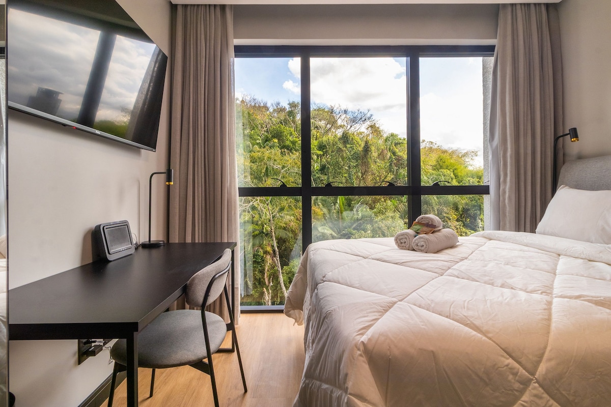 Moderno apartamento studio, localizado à 300mt do parque Vila Germânica - local de eventos como a Oktoberfest. Rodeado por restaurantes, bares, fica próximo ao Parque Ramiro Ruediger, principal área de lazer, caminhadas e exercício de Blumenau. Tudo para o seu conforto: smart Tv 43", ar-condicionado split, wifi fibra 240mb, cozinha completa com geladeira Brastemp, microondas, fogão, cafeteira, forninho, lavação com lava e seca, armário de roupas, e é claro uma cama queen convidativa!