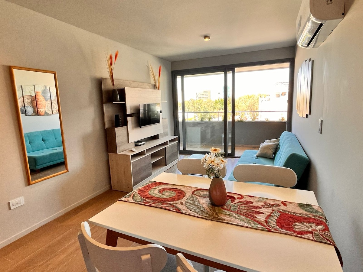 Departamento nuevo. Moderno y practico , con todas las comodidades para una excelente estadía en Neuquén. Cómodo y seguro. El edificio cuenta con pileta, solarium y portería 24 hs. Ubicado en una zona estratégica de la ciudad para desplazarse a cualquier parte. Ideal para una persona o pareja. Equipado full para 2. Calefaccion por losa radiante. Aire acondicionado frío-calor. Wifi . Smart TV 50 pulgadas