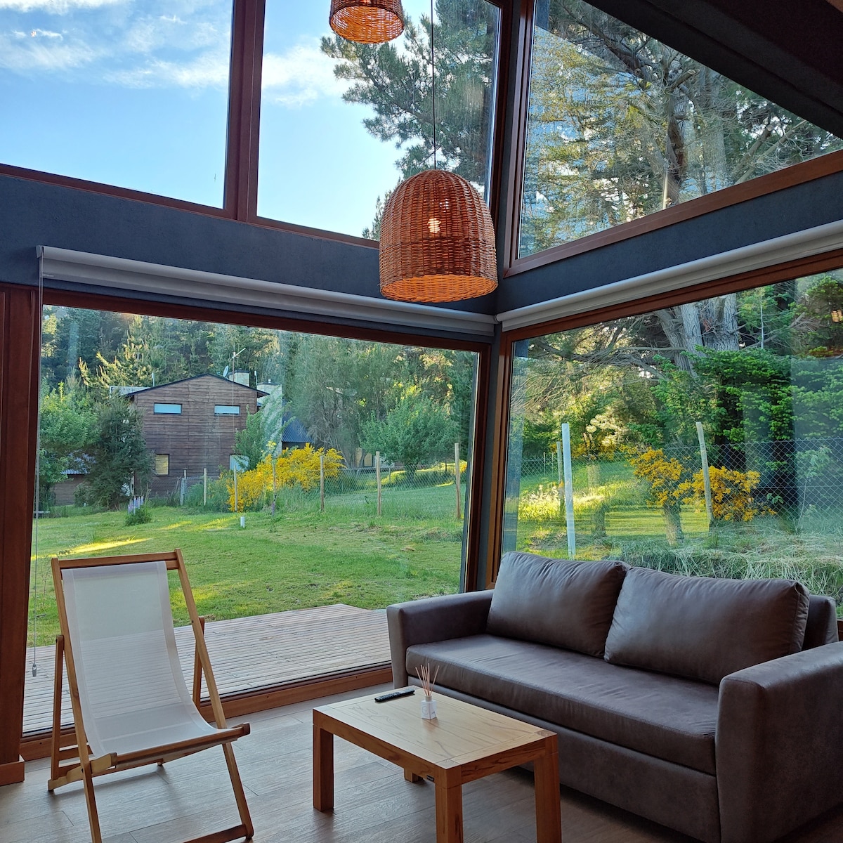 No es una casa cualquiera. De madera de cipres acerrado ahi mismo. Luminosa, amplia, bien aislada para asegurar el mínimo consumo de energía. Decoración de sencilla elegancia acorde al lugar, cuadros de fotos de Florian von der Fecht enmarcados con madera reciclada. sin vecinos, rodeada de bosque, de senderos y acceso privado al arroyo Blanco que limita la propiedad. El murmullo del Arroyo Blanco se interrumpe por el canto del huet-huet.