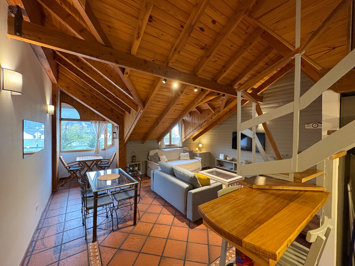 Exclusive one-bedroom loft for 4 people on the second floor in front of Nahuel Huapi Lake with view to Bariloche and the mountains. It has a bedroom with a double bed, and a double sofa bed (bed + trolley bed) in the living room (subdivided with glass). The apartment is very well equipped, with electric stove, electric oven, toaster, coffee maker, microwave oven, refrigerator and hair dryer.