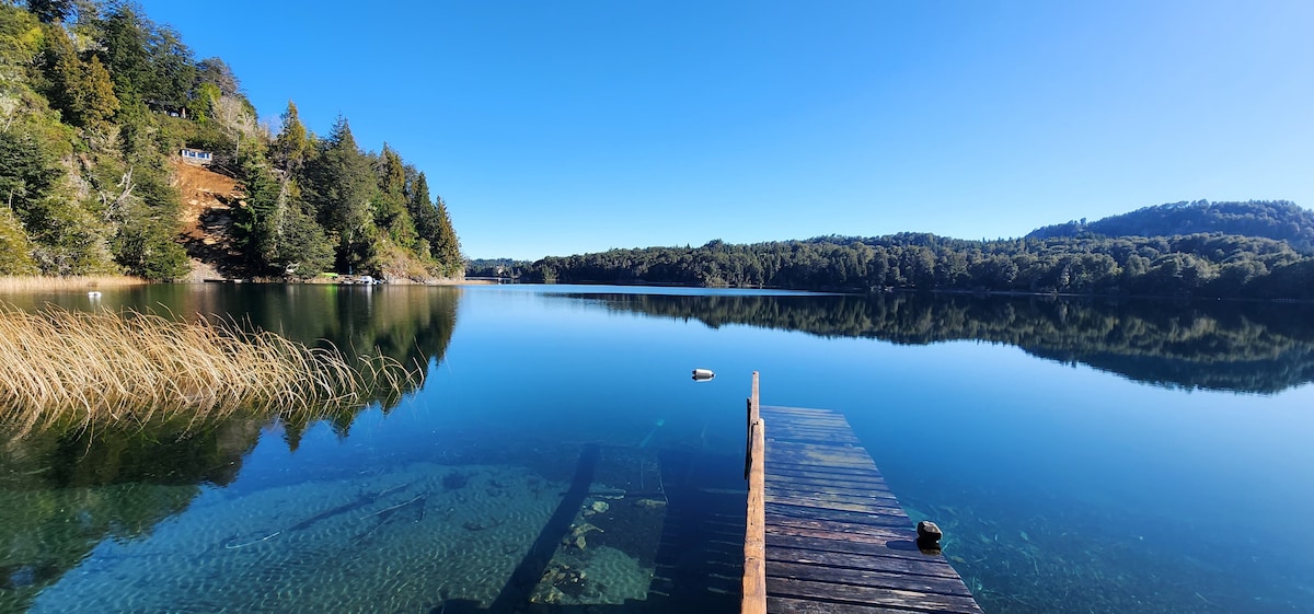 Refugio frente a lago Nahuel Huapi. Playa y bosque