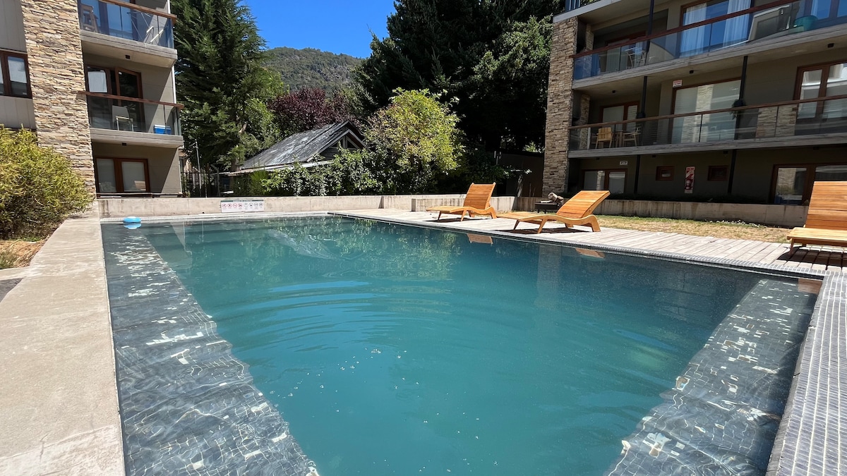Situado en el centro de San Martín de los Andes, el departamento, de un ambiente, ideal para una o dos personas, con una cama super king que se puede separar en dos de una plaza. El edificio cuenta con piscina al aire libre climatizada y WiFi. Totalmente amoblado, cocina equipada, zona de comedor, TV smart y baño completo. Ropa de cama y toallas incluidas. Cochera dentro del complejo. Excelente ubicación! cerca de todo.