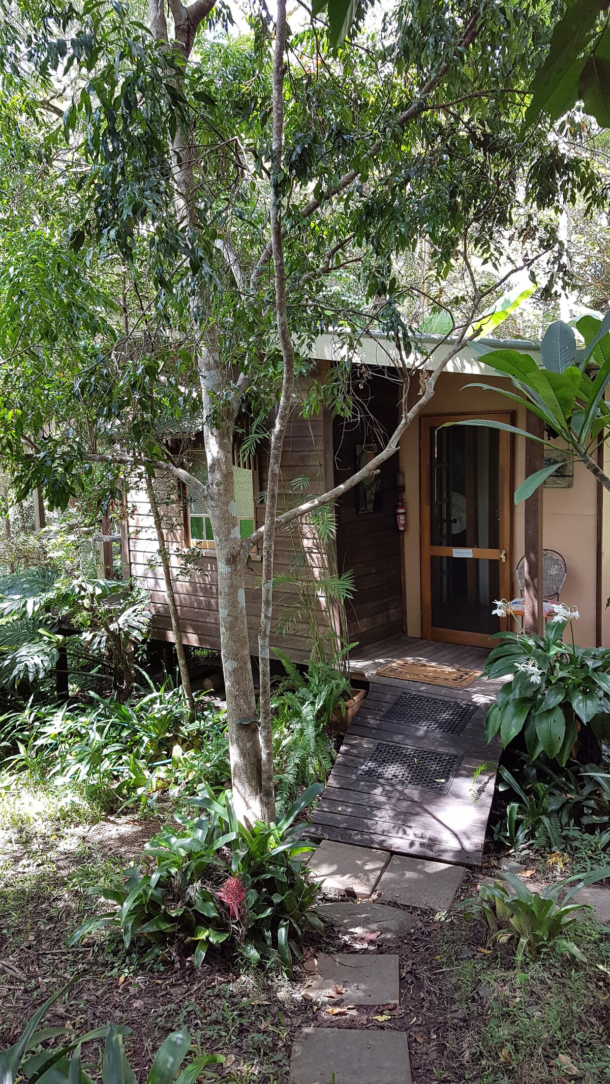 No TV, BYO Wifi. 20' basic container. Single trundle bed. Surrounded by native bush garden, on beautiful Land for Wildlife. It's small. It's unpretentious. There's a ceiling fan when the breeze is off duty. Enjoy the shower deck. Kitchen has sink, fridge, microwave, kettle, toaster and coffee pod thingamjig. You'll need a car: We're 7 min to the shops, 13 minutes to the river, 15 minutes to the surf, 25 min to the hinterland waterfalls but only 0 minutes to tranquility. Host on premises.
