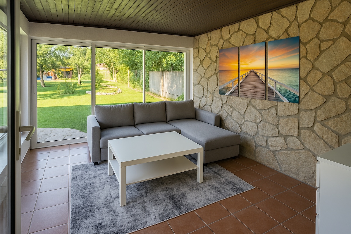 Unser gemütliches Reihenhaus, welches eingebettet zwischen dem Leithagebirge und dem Neusiedlersee in einer wunderschönen Parkanlage steht bietet Platz für 3 Personen. Das 55m2 große Anwesen unterteilt sich in Vorraum, Badezimmer mit Waschmaschine, Dusche und WC sowie einem geräumigen klimatisierten Wohn- Ess-Schlafraum welcher mit einer voll ausgestatteten Einbauküche samt befülltem Kaffeevollautomaten, einem Doppelbett und einer Schlafcouch ausgestattet ist.