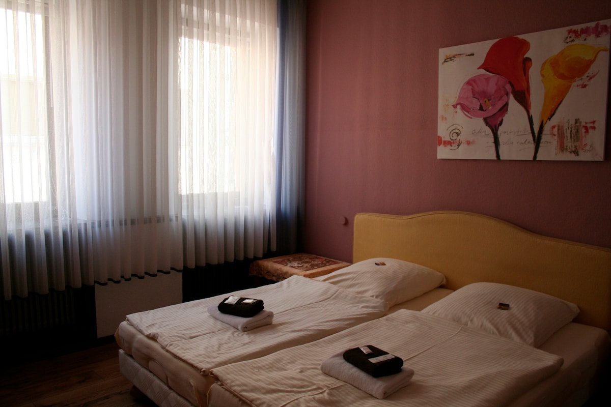 This is NOT a hotel. Room 3 is a double room with a queen bed and features a private bathroom with toilet and shower. You have a smart TV, free WIFI, mini fridge with small freezer, microwave and a water kettle. The room is only 5 minutes to Ramstein Air Base. There are stores and restaurants within walking distance and easy access to public transportation. Self-check in.