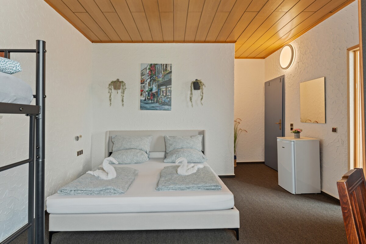 This is NOT a hotel. Room 3 is a double room with a queen bed and features a private bathroom with toilet and shower. You have a smart TV, free WIFI, mini fridge with small freezer, microwave and a water kettle. The room is only 5 minutes to Ramstein Air Base. There are stores and restaurants within walking distance and easy access to public transportation. Self-check in.