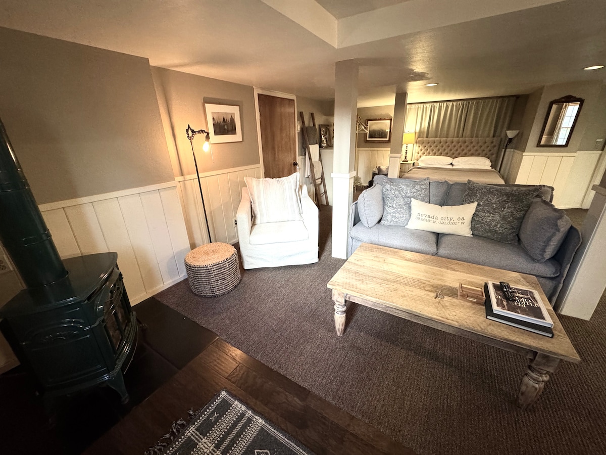 Nestled in the heart of historic Nevada City, this basement studio ( one open space no separate bedroom) is a perfect opportunity to enjoy our beautiful little town and all that it has to offer. Located a few doors up from the Methodist Church, it provides a private setting with off street parking within the city limits. Walk to shops, restaurants, walking trails and more. Newly remodeled with a kitchen and private patio. Basement has low 7 foot ceilings.