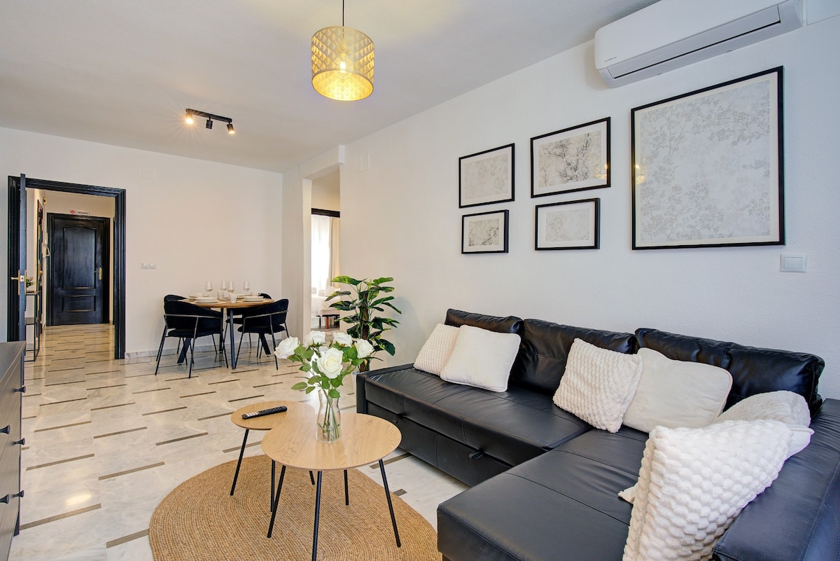 Muy bien comunicado con el centro. Amplio y luminoso, con capacidad para 5 personas con dos dormitorios, dos baños, Aire acondicionado, calefacción, TV, wifi, PISCINA (disponible solo en verano) y PARKING CERRADO INCLUIDO con cámaras de seguridad, con acceso directo en ascensor al piso. Rodeado de grandes supermercados, bares y cafeterias. IMPORTANTE: La entrada es con cerrardura inteligente, de forma autonoma, mediante aplicación gratuita para su teléfono mvl.
