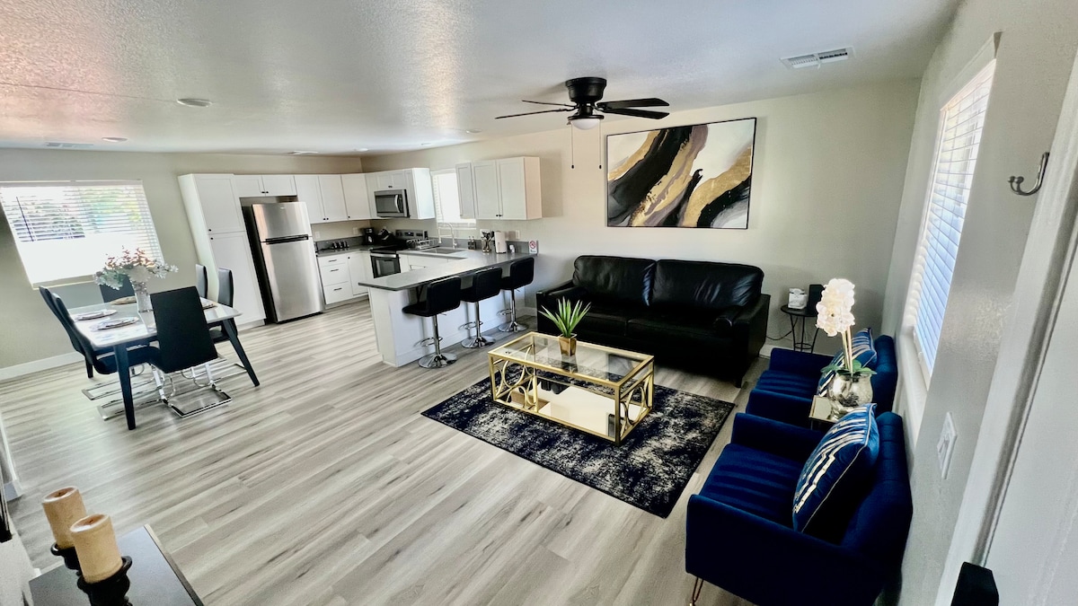 BOUTIQUE TROPICAL STUDIO RETREAT. Private, stylish, and thoughtfully designed for comfort and relaxation. Enjoy a KING BED, cozy seating area, SMART TV, FULLY EQUIPPED KITCHEN, and a PRIVATE PATIO perfect for morning coffee or evening relaxation. The studio also includes HIGH-SPEED WIFI, IN-UNIT WASHER & DRYER, and FREE PARKING. Located about 15 MINUTES FROM THE STRIP AND DOWNTOWN, offering easy access to restaurants, shopping, and entertainment while staying in a QUIET AND PEACEFUL NEIGHBORHOOD
