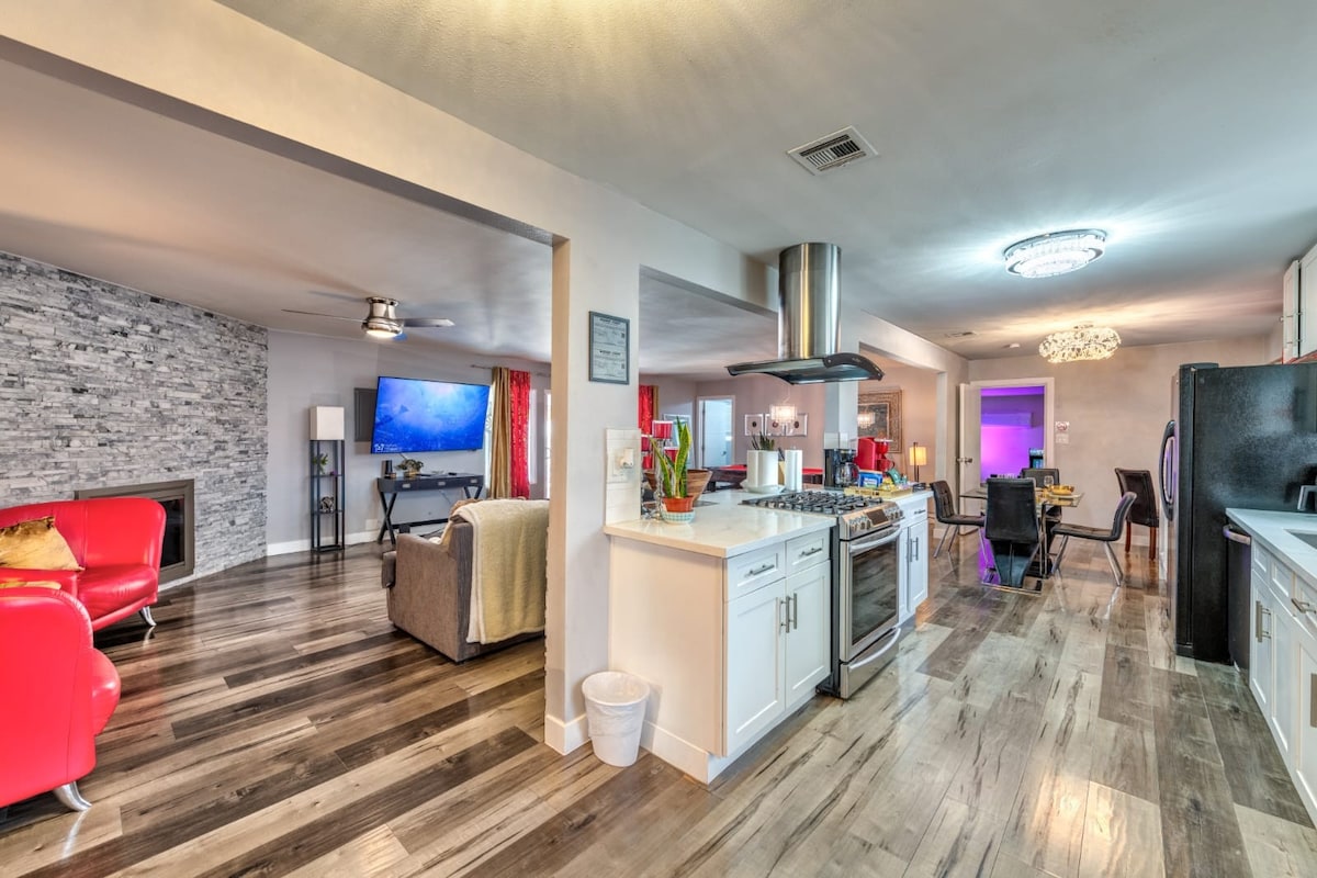 Welcome to my modern completely remodeled 1900 square foot house!. Basketball court, golf putting green and a decking with a strip view. Sunken pit sitting area. House was built in 2019 and nobody lived in it until 2022. Amazingly beautiful views from the backyard and house. Very spacious and accommodates up to 8 people comfortably. 25 foot heatable pool and jacuzzi. High speed internet and a basic cable subscription. Each bedroom has it's own smart TV and the living room has a huge smart TV.