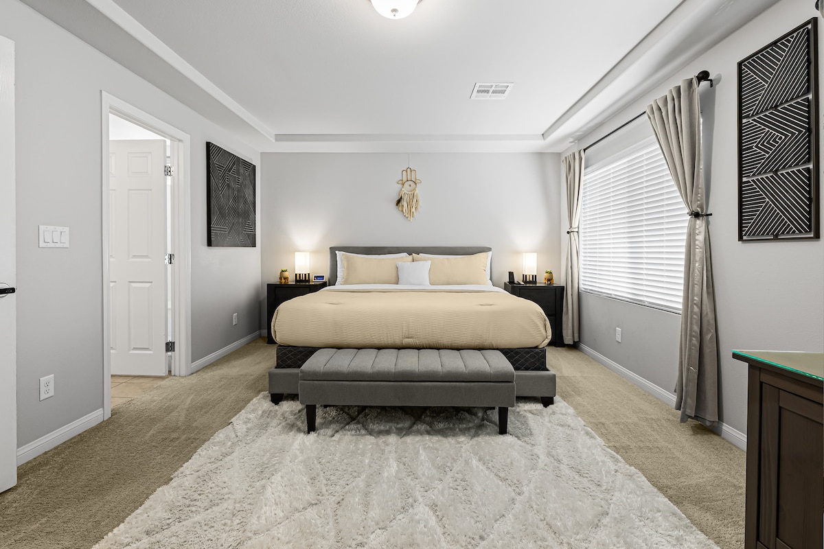 4 bedrooms (1 King/3 Queens), 2.5 bath/ 2200 sq ft home with pool/spa and putting green (pool heat xtra). Games room, well stocked kitchen, living room with 60” smart TV, beautiful heated pool & relaxing spa. Waterfall, & putting green help you enjoy beautiful Henderson in the Mission Hills area. 20 min drive to Las Vegas strip or Boulder City. Outdoor space includes lounge chairs on newly resurfaced pool deck, outdoor table with seating/ lounge area on covered patio. See details for more info.