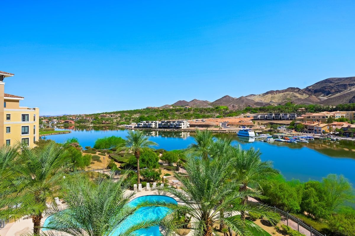 Escape the Hustle & Unwind in Style Discover your serene retreat just 20 min from Las Vegas in our remodeled luxury condo. Every detail has been crafted with deluxe materials & finishes, ensuring your utmost comfort. Relax on the deck while taking in breathtaking views of the lake, pool, & the vibrant village just steps away. Enjoy easy access to a variety of excellent restaurants and exciting activities, all within a short stroll. Registered nightly rental with City of Henderson (STR1900086)