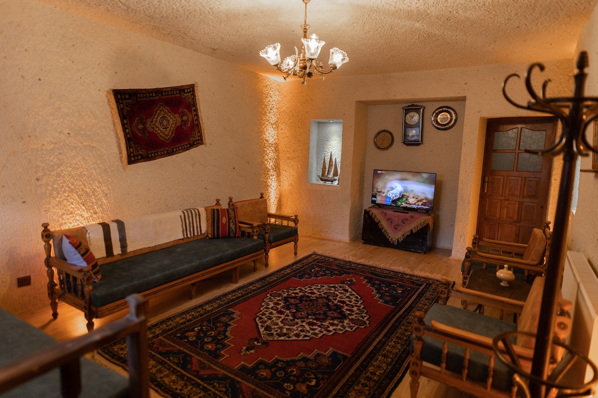 Welcome to Lost Villa, a beautifully restored three-story cave home nestled in the heart of Mustafapaşa — a quiet, historic Greek village in Cappadocia. Step back in time while enjoying modern comforts in this unique cave retreat, perfect for couples, families, or small groups. Wake up to silence, enjoy coffee on the balcony with a view of the village rooftops, and explore nearby fairy chimneys and hiking paths. In the evening, relax in your cozy cave bedroom or dine at one of the restaurants.