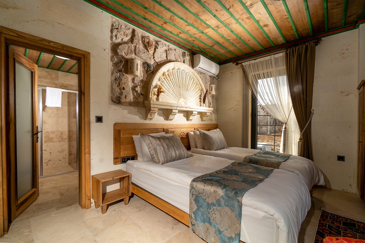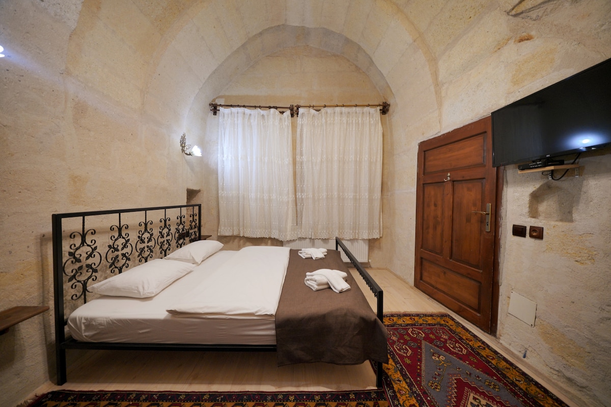 Our unique cave room has a jacuzzi, very stylish bathroom and a fireplace. Your room is 90 square meters. It is a very large room by Cappadocia standards. There are many common areas throughout the hotel. Its door opens to the garden. The hotel has a restaurant with traditional dishes and terraces that you can use. Our hotel has a flexible structure. It is always our pleasure to respond to our customers' requests. Please feel free to ask what you need.